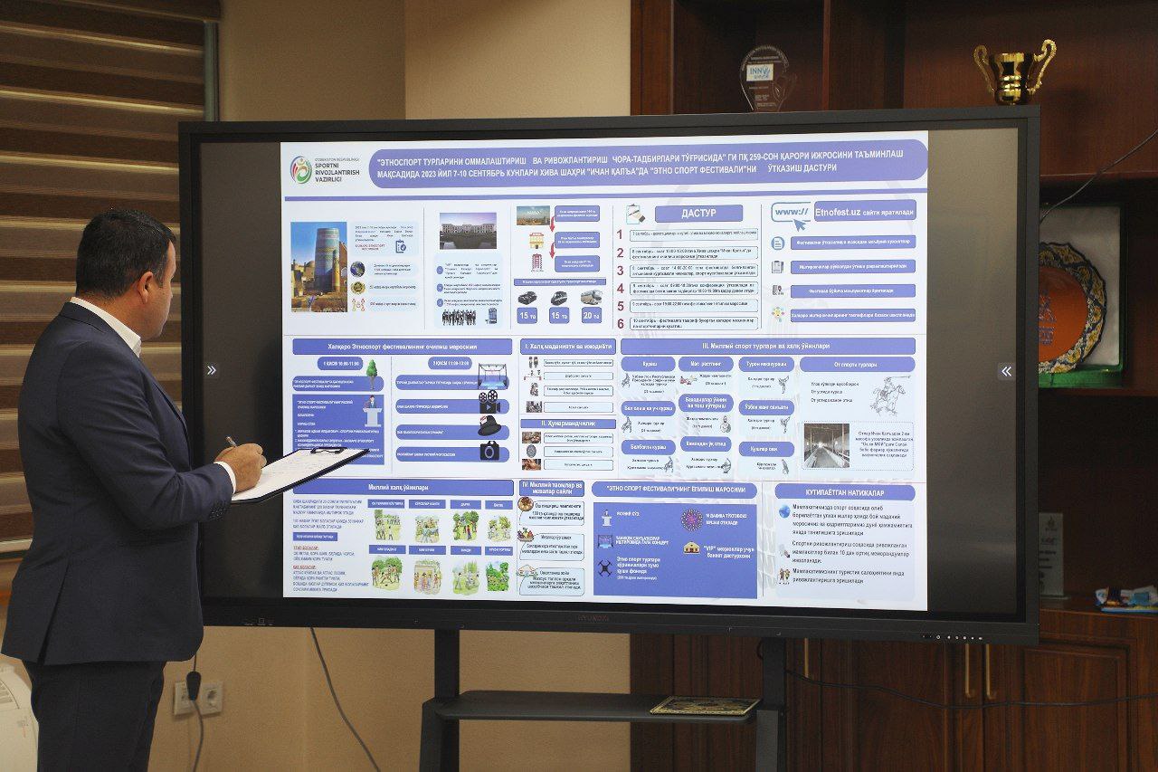 Состоялась презентация по организации международного фестиваля по этноспорту в Хиве, который планируется провести в сентябре 2023 года. В мероприятии участие принял министр Развития спорта Адхам Икрамов, который поближе ознакомился с презентацией организации данного фестиваля на высоком уровне в целях обеспечения выполнения задач, поставленных в Постановлении Президента Республики Узбекистан от 25 мая 2022 года № ПП-259 «О мерах по популяризации и развитию этноспорта». На заседании также присутствовал заместитель председателя НОК Шерзод Ташматов.