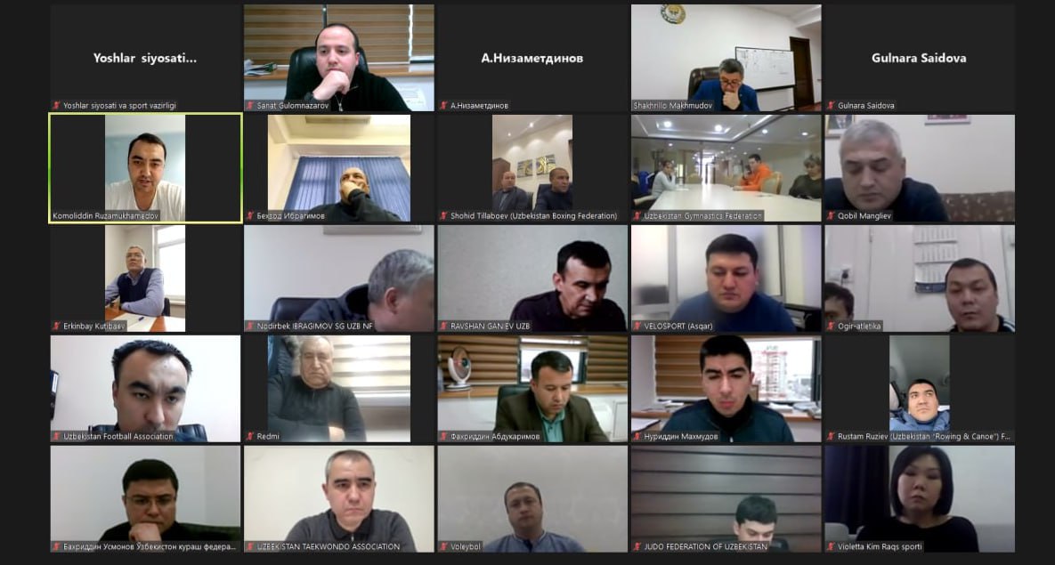 Заместитель министра Молодёжной политики и спорта Шахрулло Махмудов и заместитель председателя Национального Олимпийского комитета Шерзод Ташматов обсудили с Федерациями и Ассоциациями состояние подготовки к Олимпийским играм Париж-2024. Ответственные лица Федераций присутствовали на встрече в онлайн формате через платформу Zoom.