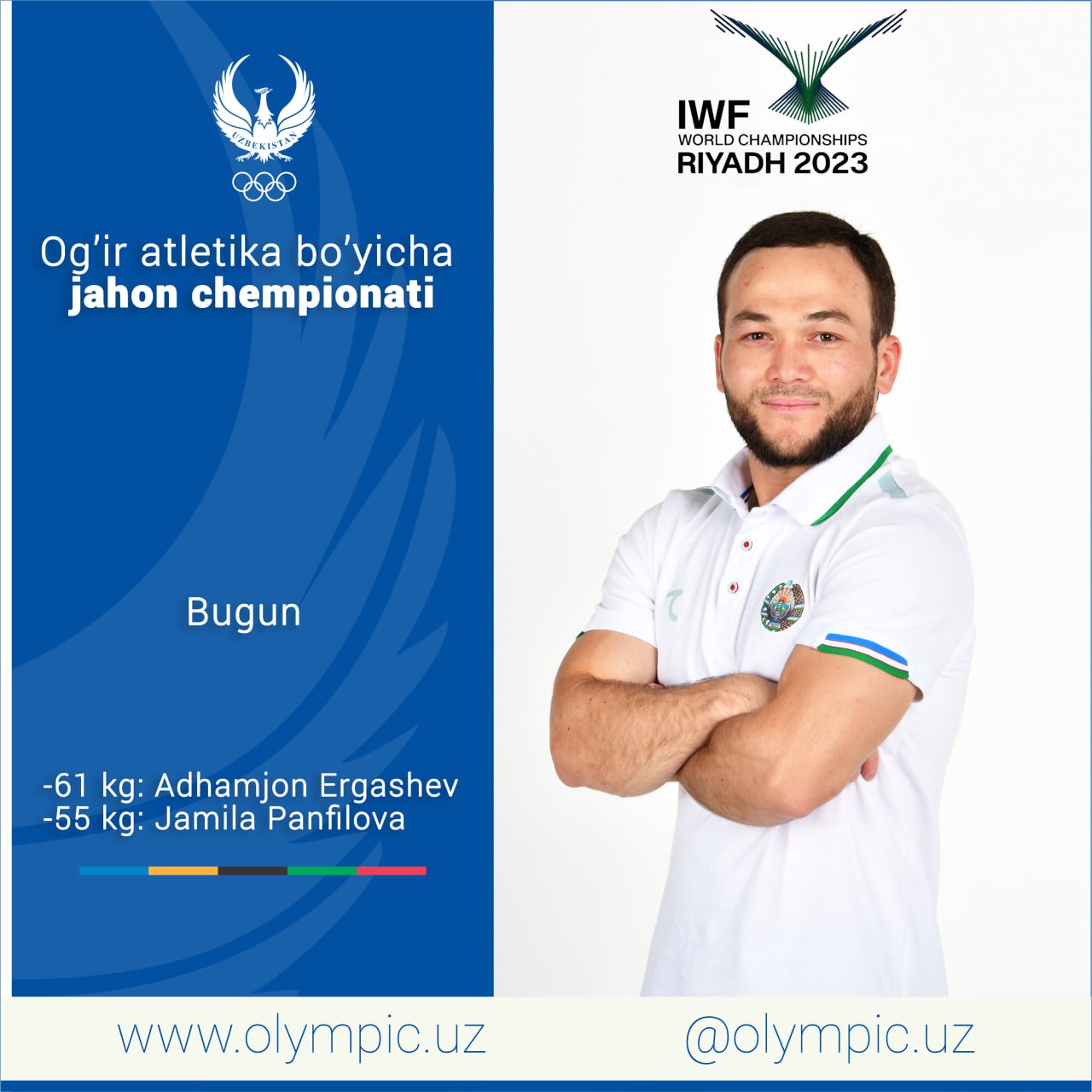 На проходящем в Саудовской Аравии чемпионате мира по тяжёлой атлетике в борьбу за награды вступают представители сборной Узбекистана. Сегодня Адхамжон Эргашев (-61 кг) и Джамила Панфилова (-55 кг) будут защищать честь нашей страны.