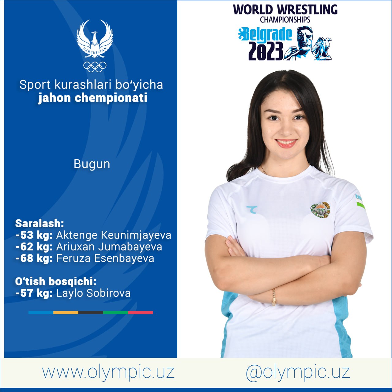 В Сербии продолжается чемпионат мира по спортивной борьбе. Сегодня мы станем свидетелями поединков очередного дня по женской борьбе. В них примут участие три узбекские спортсменки, а Лайло Собирова (-57 кг) будет бороться в утешительных схватках за бронзовую медаль.