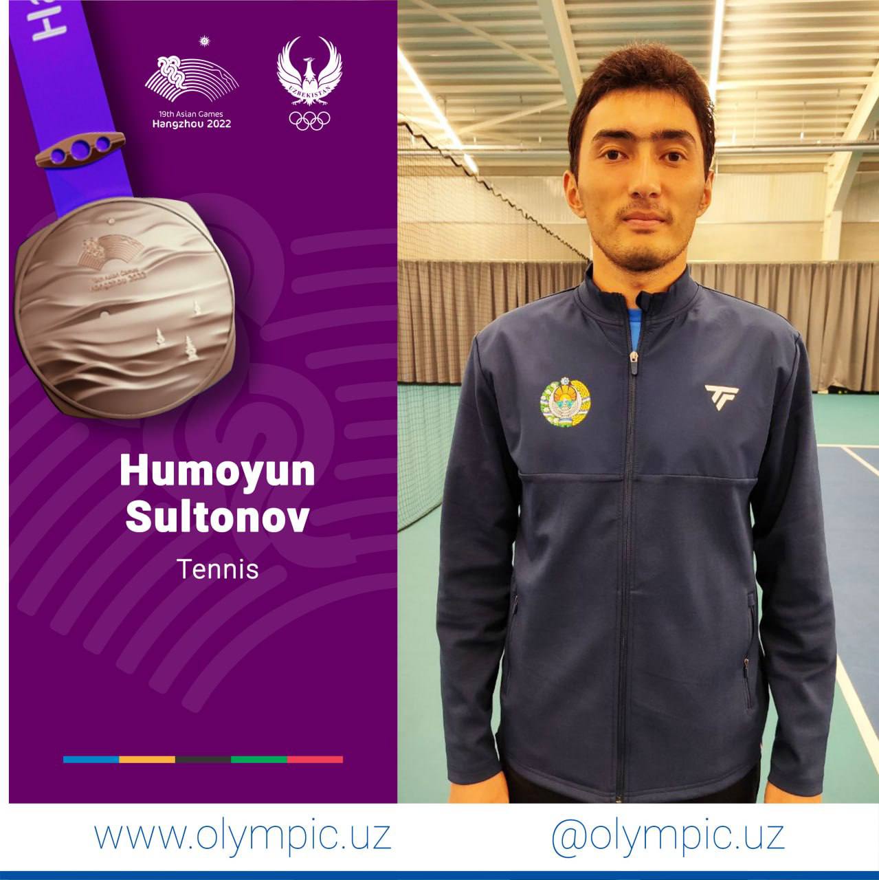 На соревнованиях по теннису наш соотечественник Хумаюн Султонов пополнил копилку делегации Узбекистана ещё одной медалью. Он в полуфинале уступил Чжинчжэнь Чжану, занимающему 60-е место в мировой квалификации, со счётом 4:6, 1:6 и завоевал бронзовую награду.