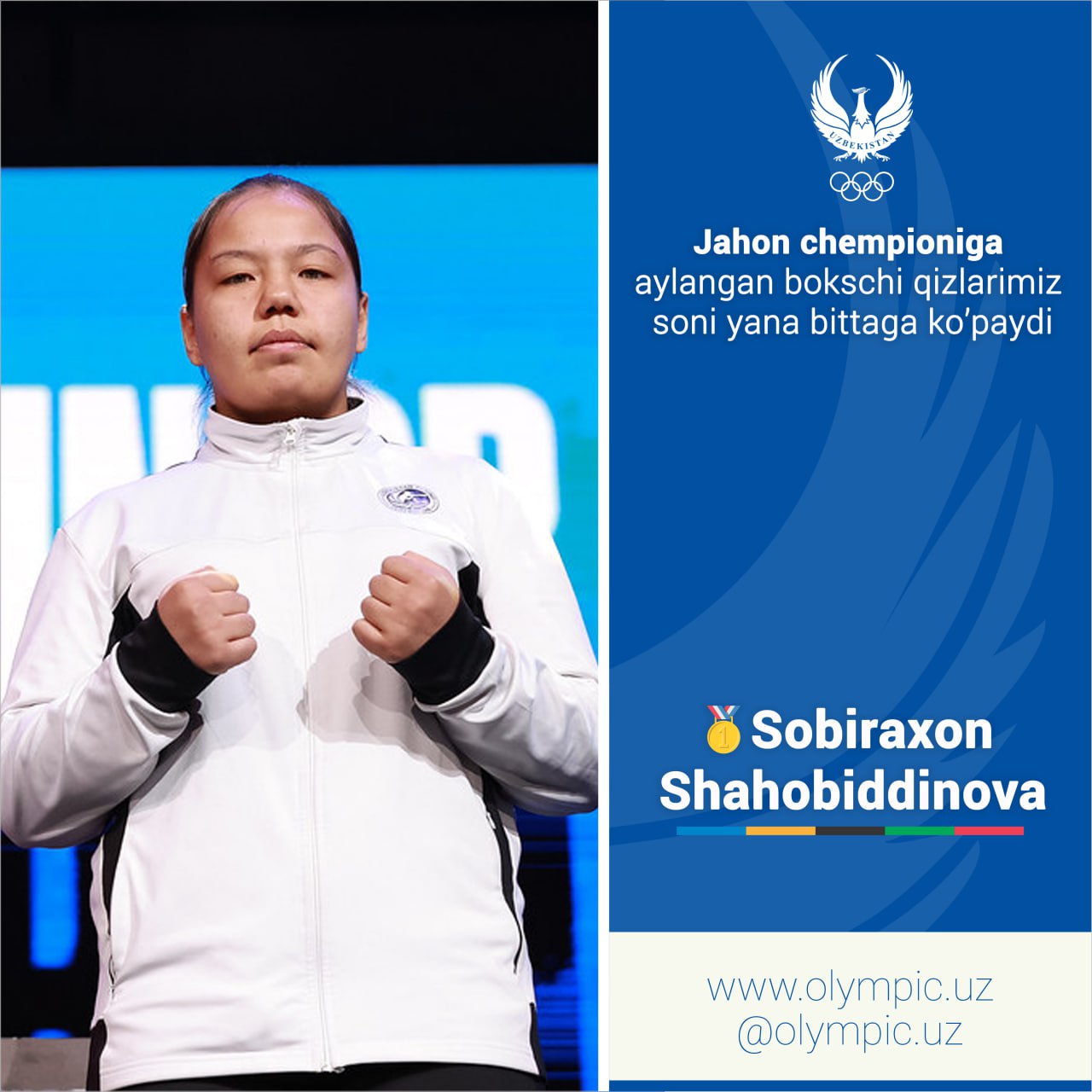 В Армении в рамках чемпионата мира по боксу среди юниоров завершился первый день финала. Как ранее сообщалось, 4 наших представителей поднялись на ринг за золотую медаль. Среди них Собирахон Шахобиддинова (+80 кг) победила свою соперницу и завоевала золотую медаль первенства мира. А остальные 3 представителей Узбекистана удостоились серебра. Подробно: