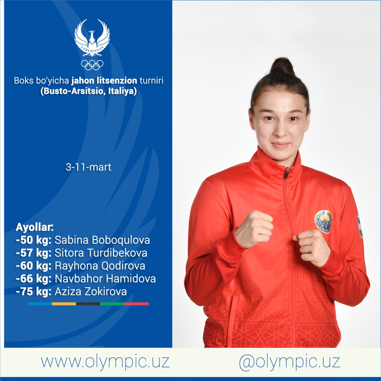 3-11 марта Италия примет мировой турнир по боксу, где будут разыгрываться лицензии Олимпийских игр Париж-2024. Федерация бокса Узбекистана объявила имена боксёров, которые выступят в этом важном соревновании. Согласно принятому решению, следующие наши представители выйдут на ринг за путёвки Олимпиады:
