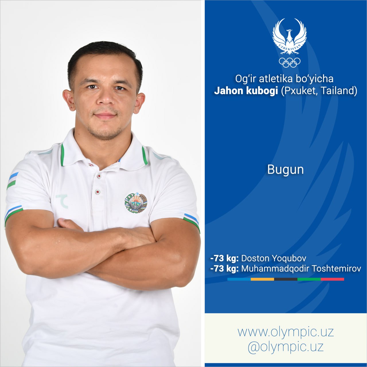 Сегодня в Таиланде пройдёт очередной день Кубка мира по тяжёлой атлетике. В настоящее время выступают двое наших соотечественников в группе "С" - Достон Ёкубов и Мухаммадкадыр Тоштемиров, в весовой категории -73 кг.