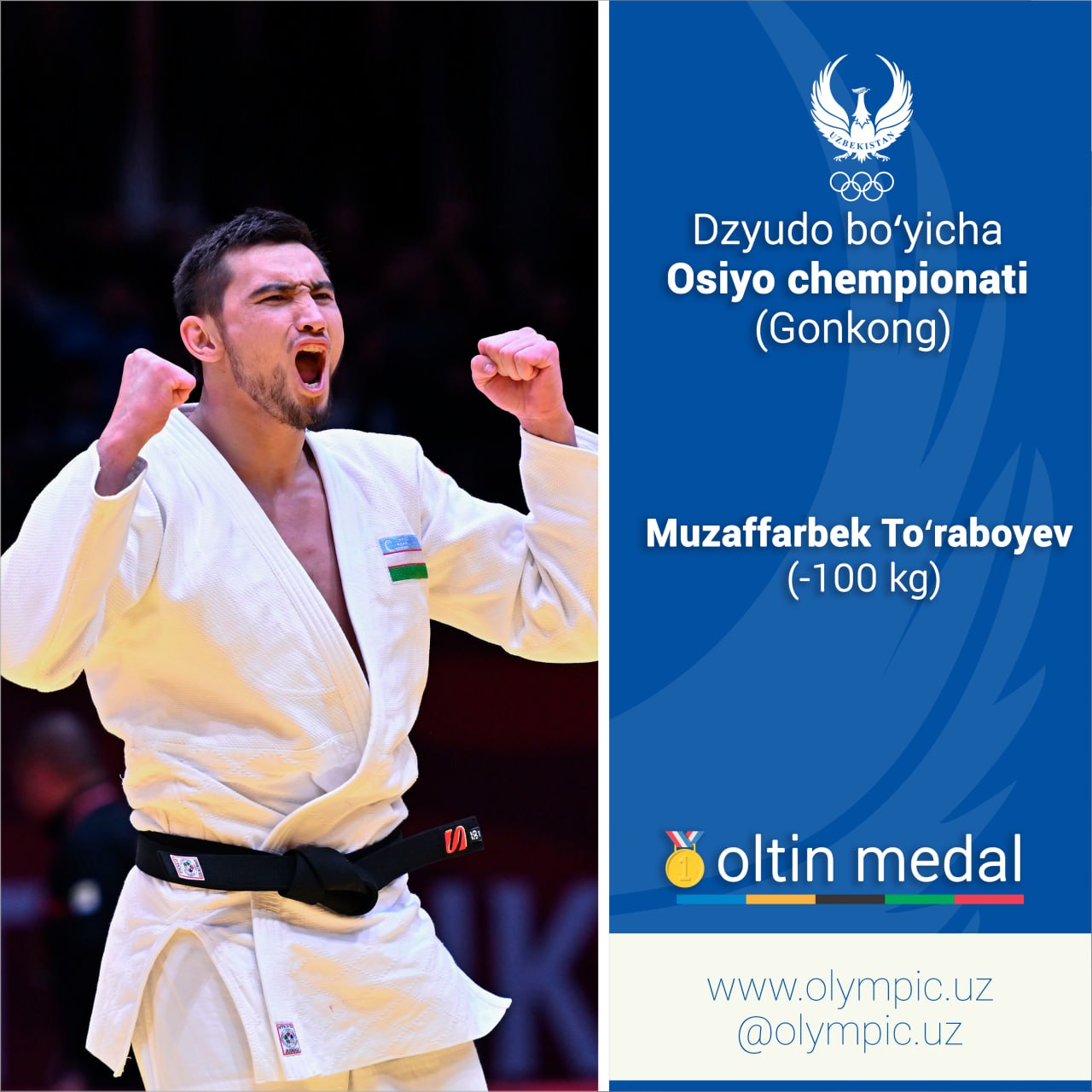 Сборная Узбекистана по дзюдо в рамках континентального первенства в Гонконге завоевала первую золотую медаль. Чемпион Азиады Ханчжоу-2022 Музаффарбек Турабоев, выступавший в весовой категории -100 кг, преодолел всех своих соперников и поднялся на высшую ступень пьедестала. В решающей схватке наш дзюдоист победил представителя ОАЭ Джафара Костоева.