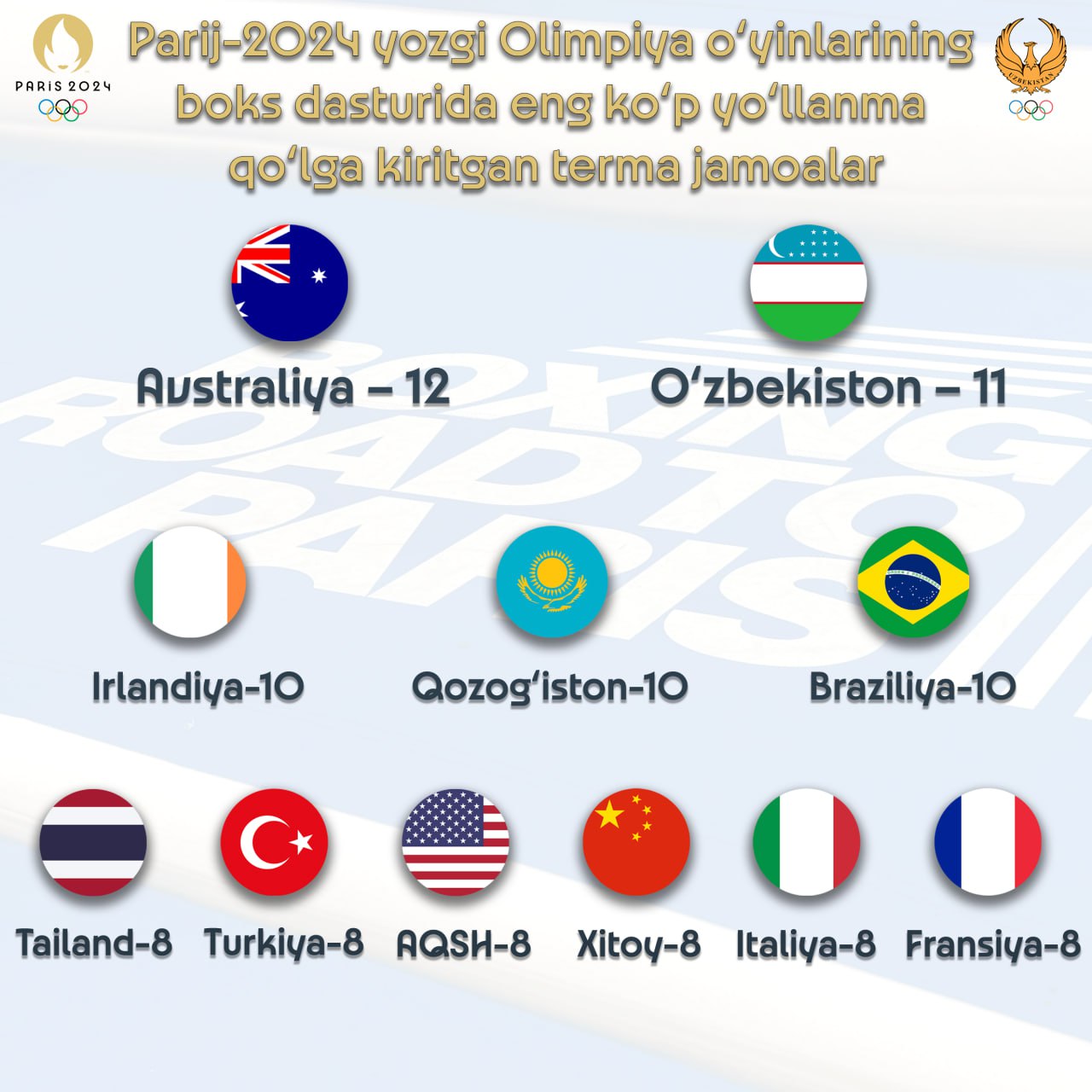 Напомним, что по итогам квалификационного этапа сборная Узбекистана завоевала 11 путёвок на летние Олимпийские игры Париж-2024 (7 мужчин и 4 женщины). Следует отметить, что боксёрши Узбекистана впервые удостоились 4 лицензий на главные старты четырёхлетия, а мужская сборная третий раз подряд завоевала Олимпийские путёвки в полном составе.