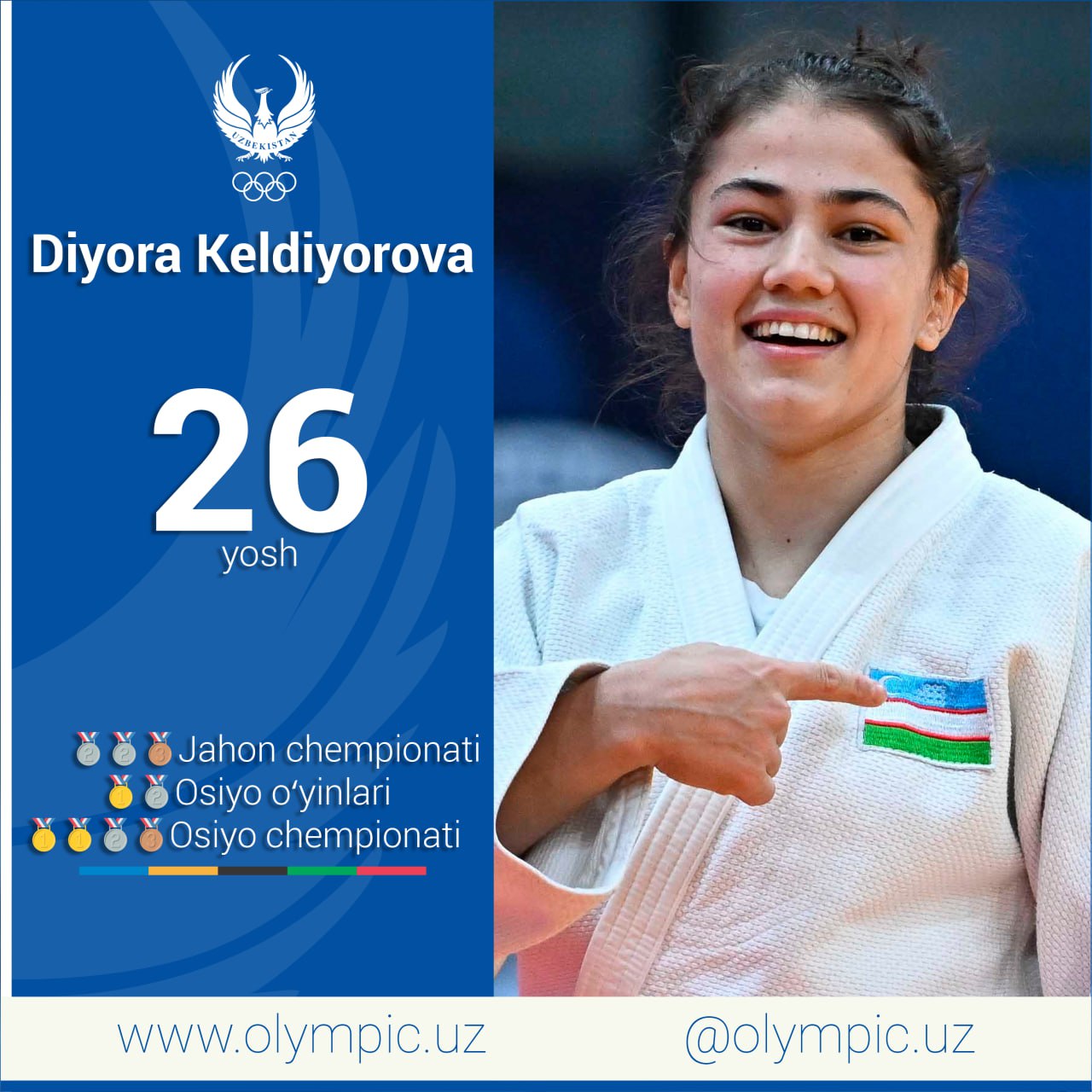 Сегодня представитель сборной Узбекистана по греко-римской борьбе, двукратный призёр чемпионатов мира, победитель летних Азиатских игр Инчхон-2014, трёхкратный чемпион Азии Рустам Ассакалов и трекратная призёрка чемпионата мира по дзюдо, обладательница золотой и серебряной медалей летних Азиатских игр Ханчжоу-2022, двукратная чемпионка континента, обладательница медали "Келажак бунёдкори" и почётного звания "Заслуженная спортсменка Республики Узбекистан" Диёра Келдиёрова отмечают свой День рождения.