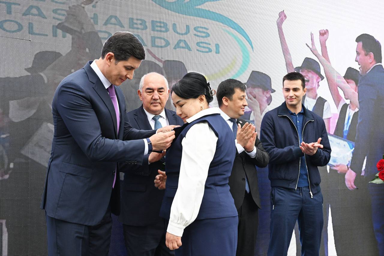 После официальной части церемонии открытия спортивных соревнований под девизом «Здоровый человек — здоровая нация», представители Министерства посетили школу и вручили нагрудный знак директору — Саидхужаевой Нигоре Эргашевне.