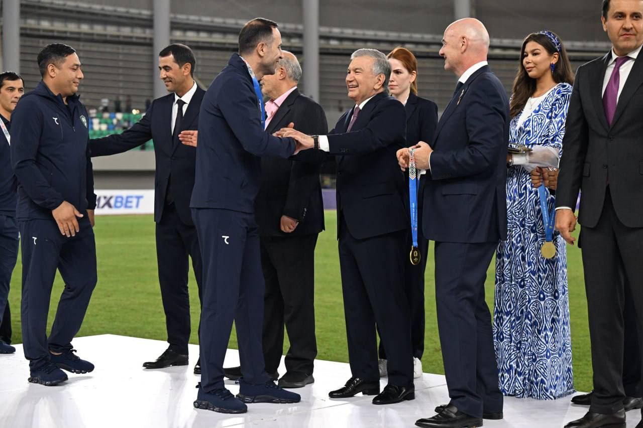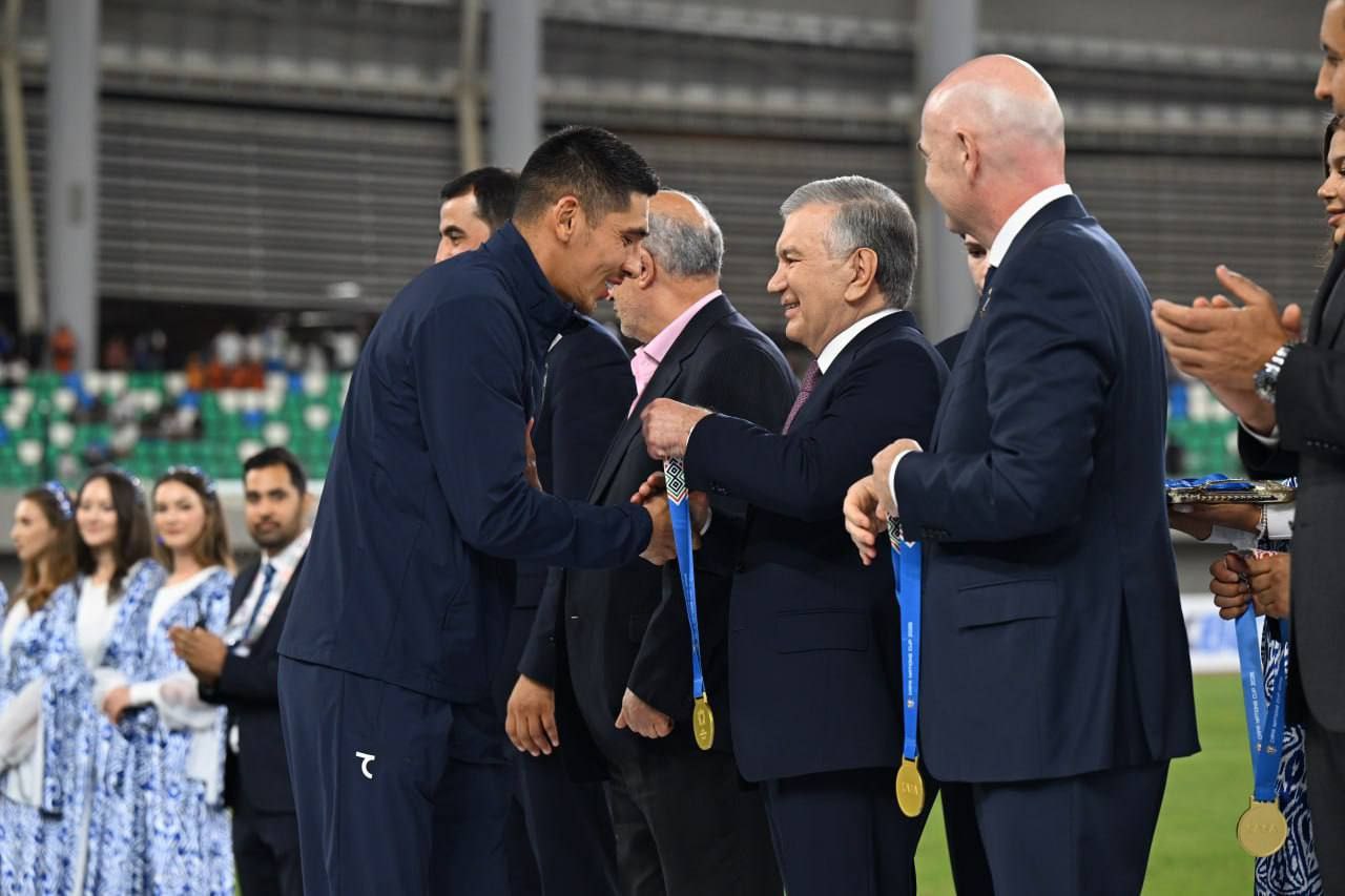 Золотые медали и кубок нашим футболистам вручил Президент Шавкат Мирзиёев. В церемонии награждения также приняли участие президент ФИФА Джанни Инфантино и другие официальные лица.