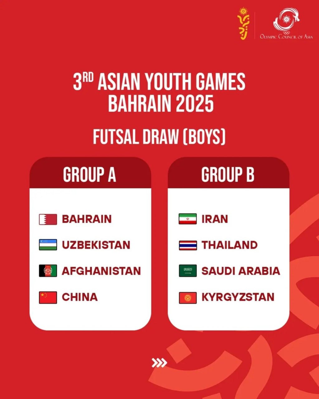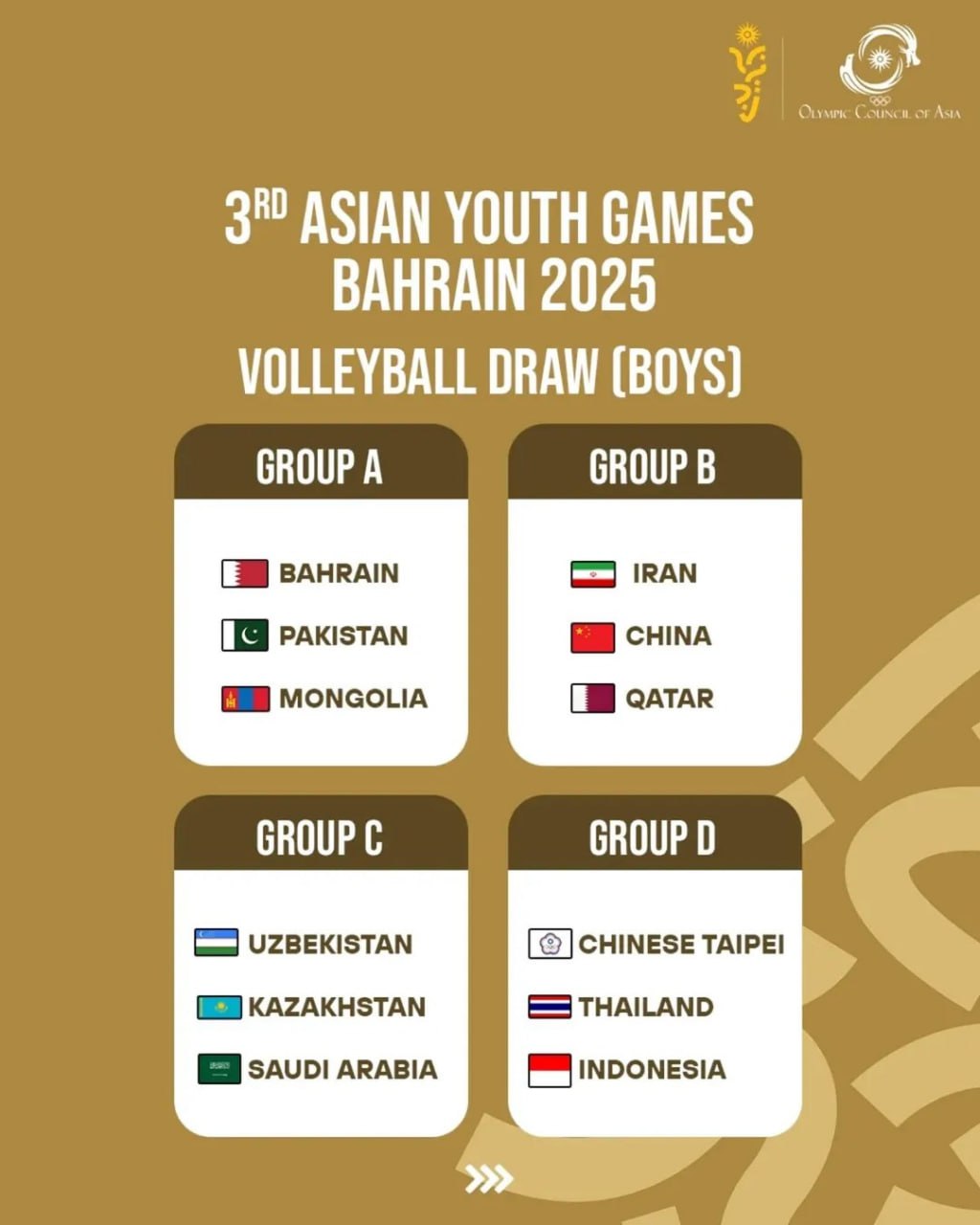 Состоялась жеребьёвка по командным видам спорта, включённым в программу юношеских Азиатских игр Бахрейн-2025, которые пройдут с 22 по 31 октября. Согласно результатам жеребьёвки, наши команды распределились по следующим группам: