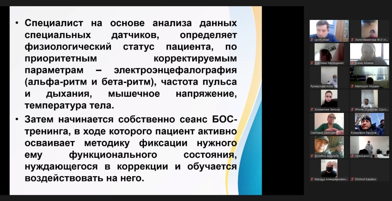 Даставвал Биобошқаришни текшириш усуллари ҳамда ушбу ускунадан фойдаланиш бўйича малакасини ошириб келган тиббиёт фанлари доктори, невролог Зиёда Акбархўжаева ўз малакаси билан бўлишди. Шундан сўнг иштирокчилар бу борада ўзларини қизиқтирган саволларига атрофлича жавоб олишди.
