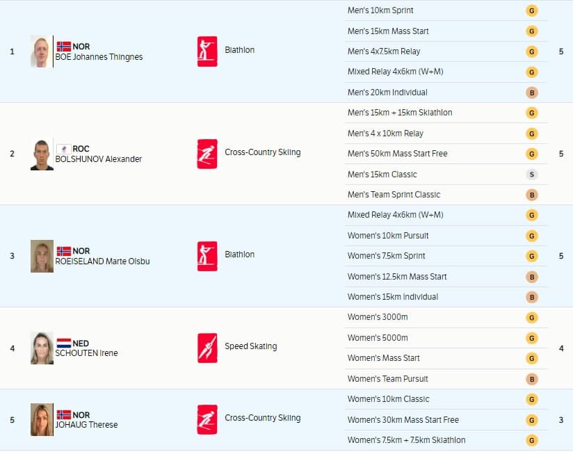 Норвегиялик таниқли биатлончи Йоханнес Бьё якунига етган Пекин-2022 қишки Олимпия ўйинларида энг кўп медаль қўлга киритган спортчи бўлди. Ушбу Олимпиадада у 4 та олтин ва 1 та бронза медалларини қўлга киритди. Ундан кейинги ўринда 3 та олтин, 1 та кумуш ва 1 та бронза медаллари билан россиялик Александр Болшунов ва 3 та олтин ҳамда 2 та бронза медалига сазовор бўлган норвегиялик бошқа бир биатлончи Марту Роиселанд жой олишди.