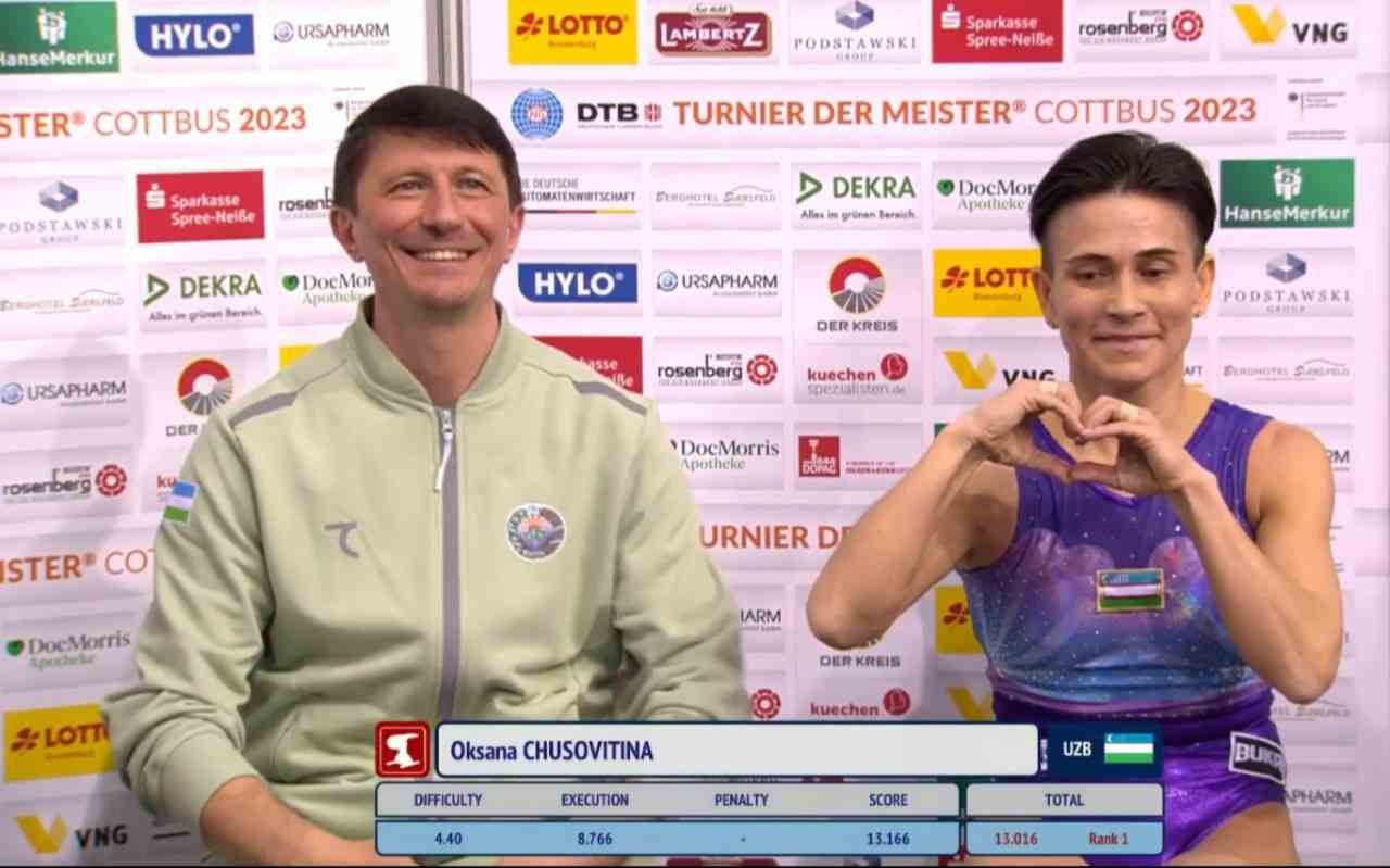 Шунингдек, Оксана Чусовитина таяниб сакраш дастурида совриндорлар қаторидан жой олди. Чусовитина ушбу машқда 13.016 балл билан бронза медали соҳиби бўлди. Дилдора Арипованинг мазкур дастурдаги чиқишини ҳакамлар 12.416 балл билан баҳолашди ва бу финалчилар орасидаги саккизинчи кўрсаткич сифатида қайд этилди. Арипова эртага тўсиндаги машқда медаллар учун курашади.