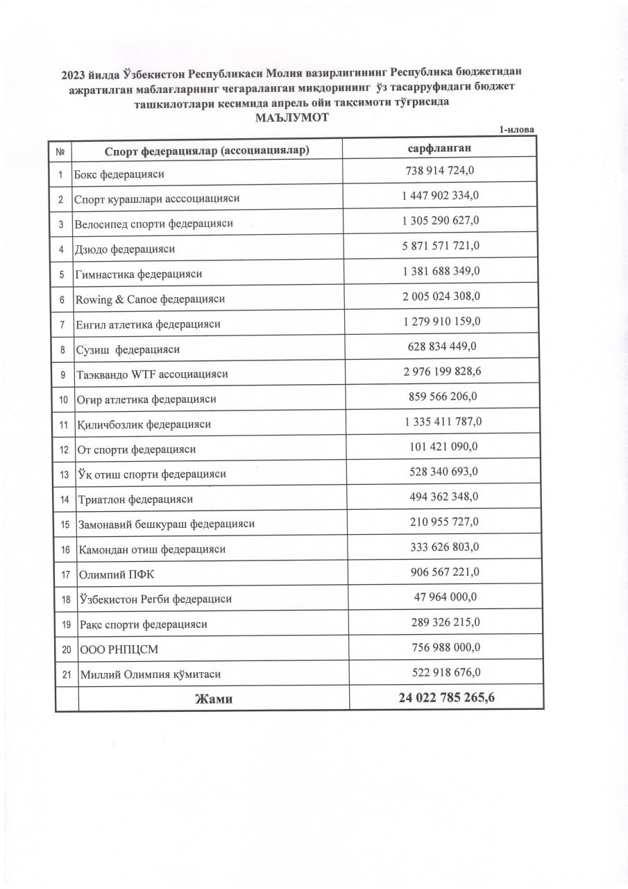 Апрель ойида терма жамоаларимизнинг Париж-2024 Олимпия ўйинларига тайёргарлиги учун сарфланган маблағлар тўғрисида МАЪЛУМОТ