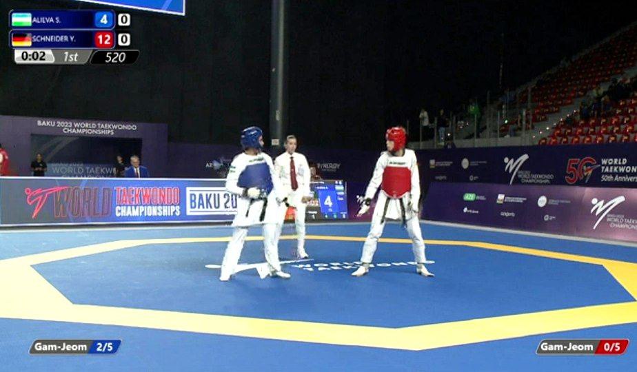 Бокуда ўтаётган таэквондо бўйича жаҳон чемпионатининг бугунги куни юртдошларимиз учун ниҳоясига етди. -73 кг вазн тоифасида даянга чиққан Саодатбегим Алиева германиялик Янна Шнайдерга имкониятни бой берди.