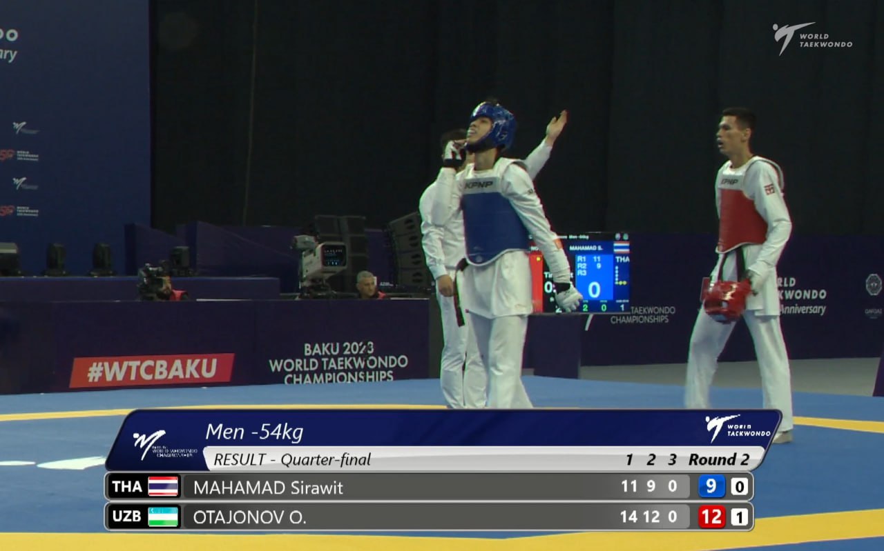 Таэквондо бўйича Ўзбекистон терма жамоаси жаҳон чемпионатининг навбатдаги кунида яна бир медални нақд қилди. -54 кг вазн тоифасида жанг қилаётган Омонжон Отажонов ярим финал йўлланмасига сазовор бўлди. Ҳамюртимиз чорак финалда таиландлик Сариват Махамадни 2:0 ҳисобида мағлубиятга учратиб, камида бронза медалини нақд қилди. Олға, Омонжон!