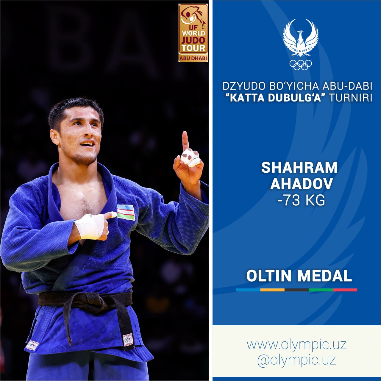 Дзюдо бўйича Ўзбекистон терма жамоаси аъзоси Шаҳрам Аҳадов фаолиятида биринчи бор “Катта дубулға” таснифига кирувчи мусобақада ғалаба қозонди. -73 кг вазн тоифасида иштирок этган юртдошимиз Абу-Даби турнирида муросасиз кечган финал беллашувида косоволик Акил Гяковадан устун келди. Ушбу натижа унга жаҳон ва Париж-2024 Олимпиадаси рейтинги учун 1000 очко тақдим қилади.