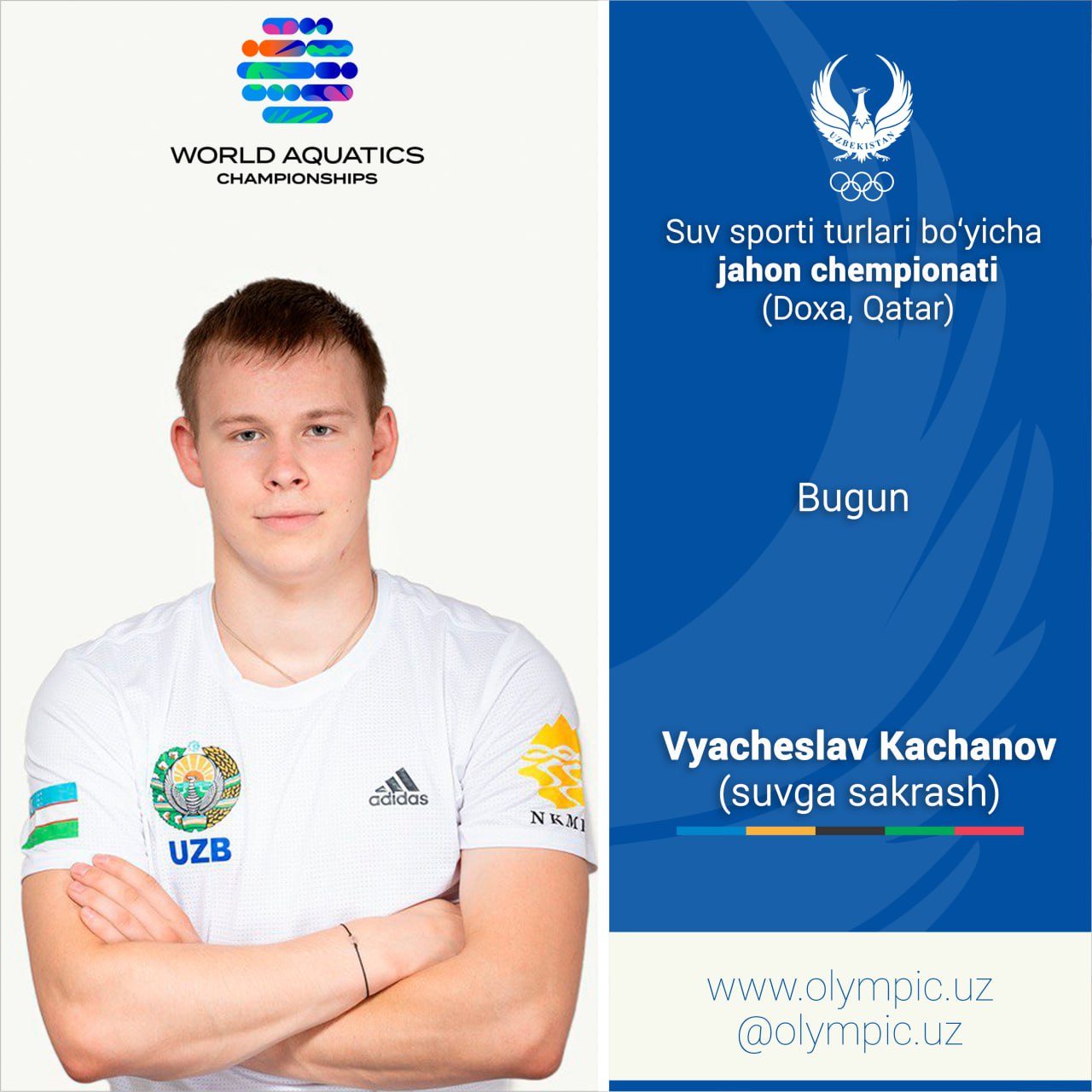 Доха шаҳри мезбонлик қилаётган сув спорти турлари бўйича жаҳон чемпионатининг иккинчи кунида Ўзбекистон терма жамоаси аъзоси Вячеслав Качанов сувга сакраш йўналишида иштирок этади. Ҳамюртимиз 1 метрли трамплиндан сакраш дастурида ўз омадини синаб кўради.