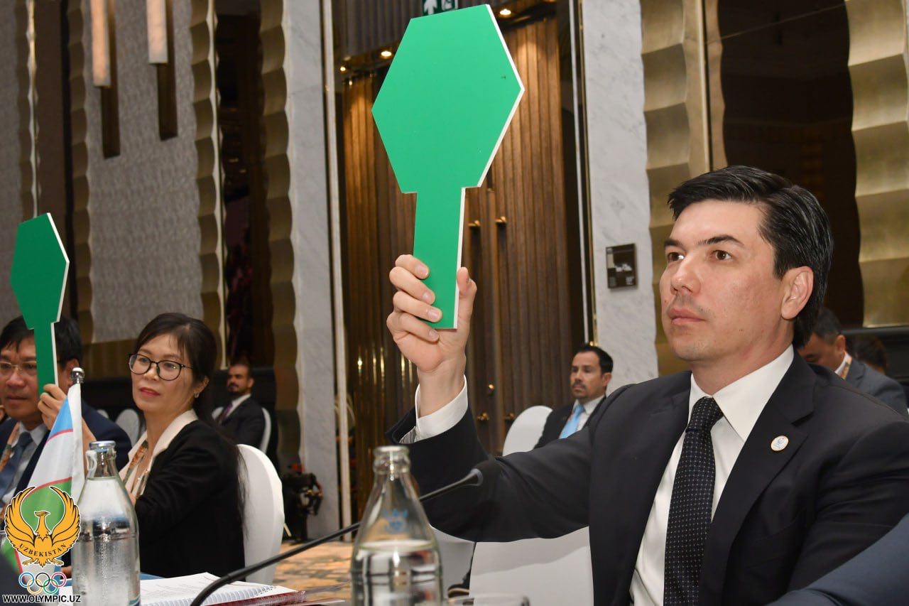 Тадбирда Ўзбекистон номидан ООК вице-президенти Отабек Умаров ва МОҚ Бош котиби Ойбек Касимов иштирок этишди. Қайд этиш жоиз, ООК конституциясига ўзгартириш киритиш ишлари анча аввал бошланган бўлиб, бу бўйича тузилган комиссияга Марказий Осиё минтақасидан Ойбек Омилович жалб қилинган эди. Якунда конституцияга киритилган ўзгаришлар барча Миллий Олимпия қўмиталари томонидан бир овоздан маъқулланди.