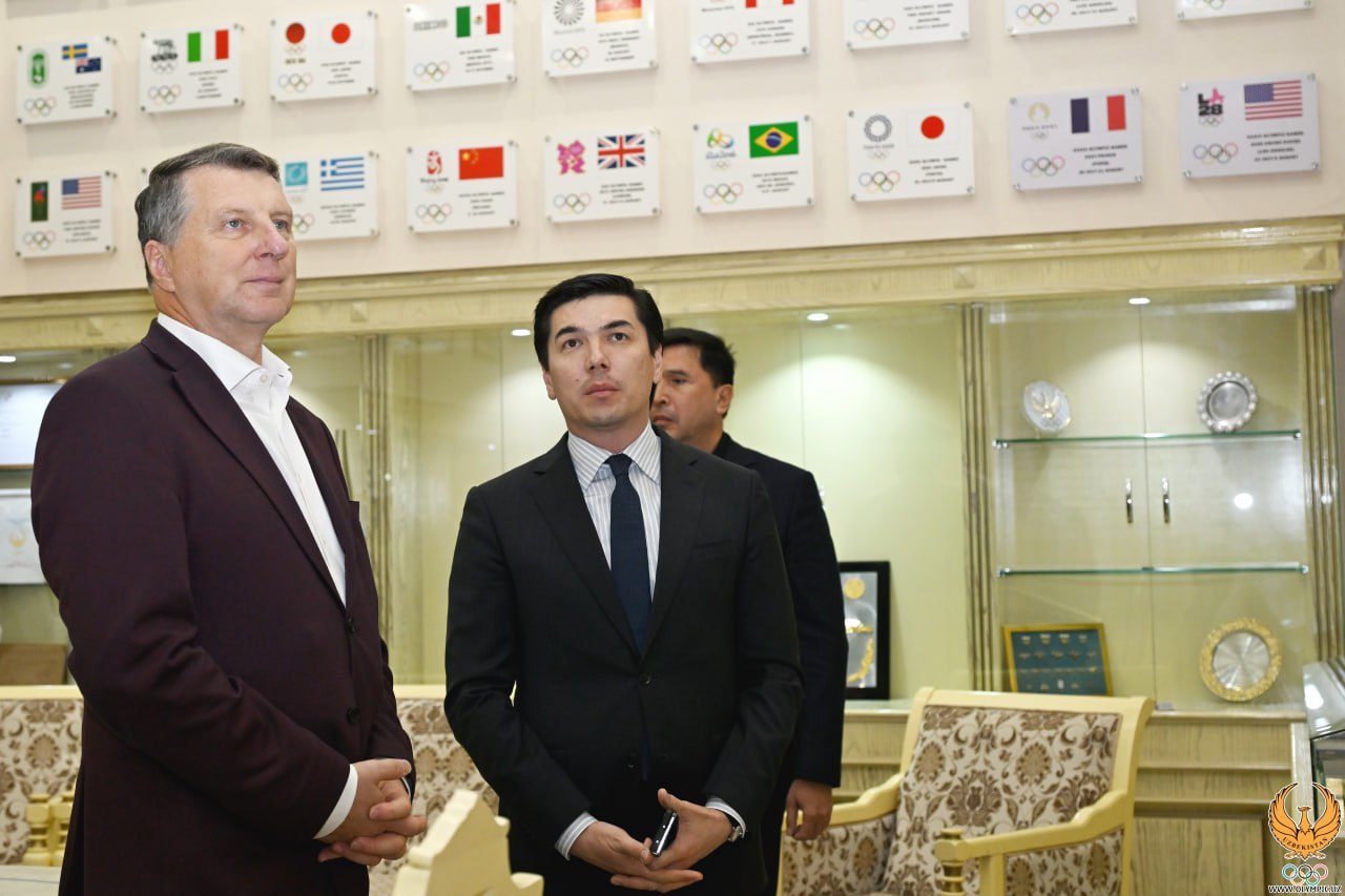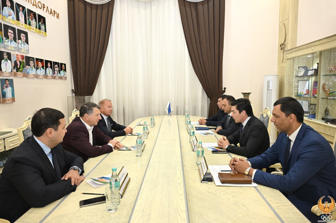 Учрашув аввалида Ойбек Омилович фахрий меҳмонларни қутлашдан мамнун эканини таъкидлаб, уларга юртимиздаги спорт ривожида МОҚ ва Спорт вазирлигининг федерация ҳамда ассоциациялар билан олиб бораётган тизимли ҳамкорлиги, терма жамоаларимиз захирасини иқтидорли ёшлар билан бойитиш борасида йўлга қўйилган селекция ишлари, делегациямизнинг Париж-2024 ёзги Олимпия ўйинларида қўлга киритган тарихий натижаси ҳақида тўхталди. Шунингдек, у давлатимиз раҳбари топшириғи билан жамоавий спорт турларини ривожлантиришга алоҳида эътибор қаратилиши, Лос-Анжелес-2028 ёзги Олимпия ўйинларига ҳозирданоқ тайёргарлик бошлангани хусусида маълумот бериб ўтди.
