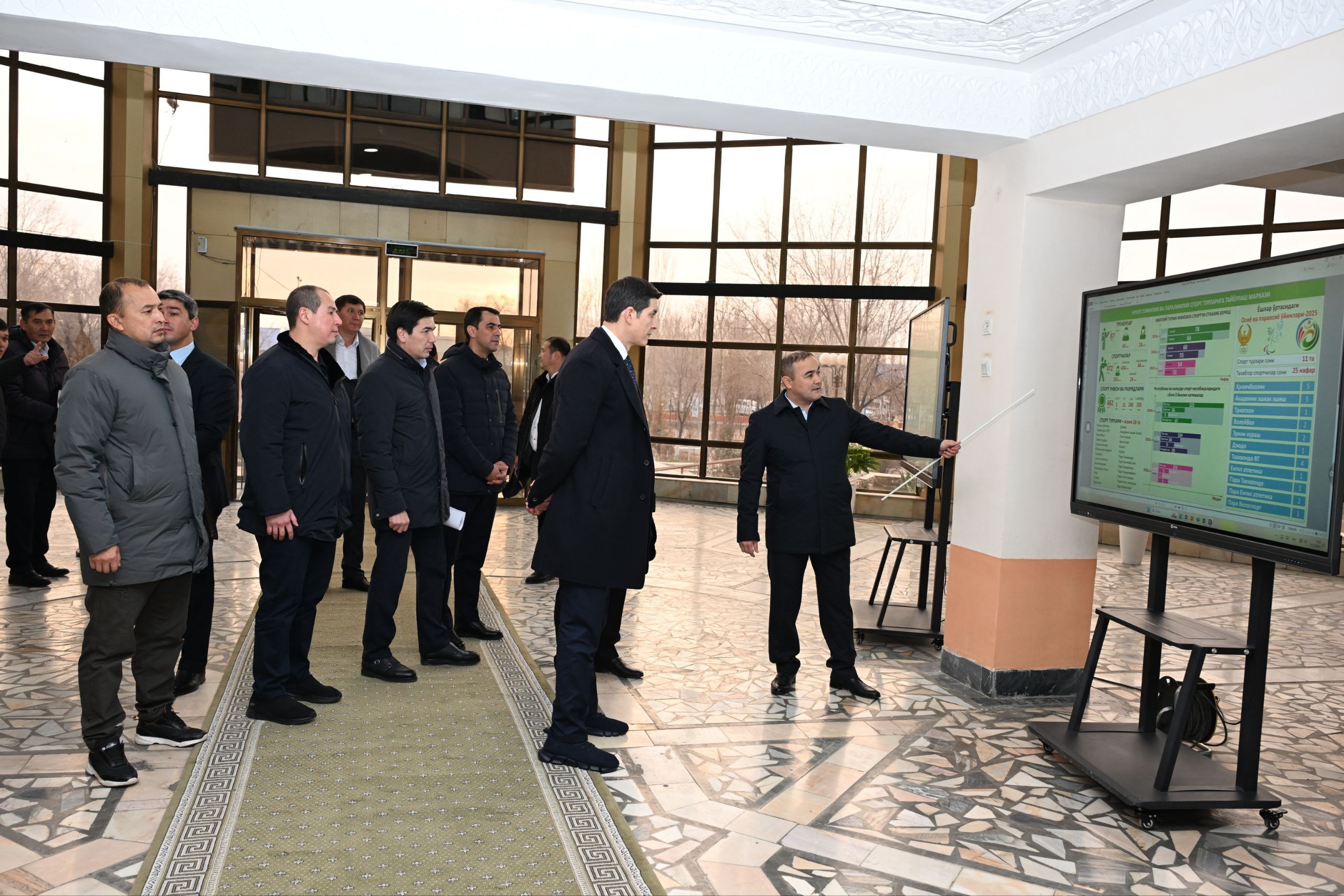 Ўрганиш ишлари якунида Қорақалпоғистон Республикаси Жўқорғи Кенгесининг Раиси Аманбай Оринбаев, Вазирлар Кенгаши раиси Фарҳод Эрманов ва соҳа мутасаддилари иштирокида йиғилиш бўлиб ўтди. Унда ҳудудий федерацияларнинг иш фаолиятини кучайтириш, жамоавий спорт турларига ҳам эътибор қаратиш, янги Олимпия циклида терма жамоа таркибига номзод спортчиларни ижтимоий қўллаб-қувватлаш каби мавзуларда маслаҳат берилди ва бу борада маҳаллий мутахассисларнинг таклиф ва тавсиялари тингланди.