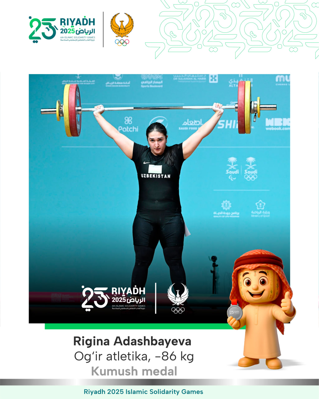 Оғир атлетикачимиз Ригина Адашбаева (-86 кг) Ислом бирдамлиги ўйинларини 3 та кумуш медаль билан яку...