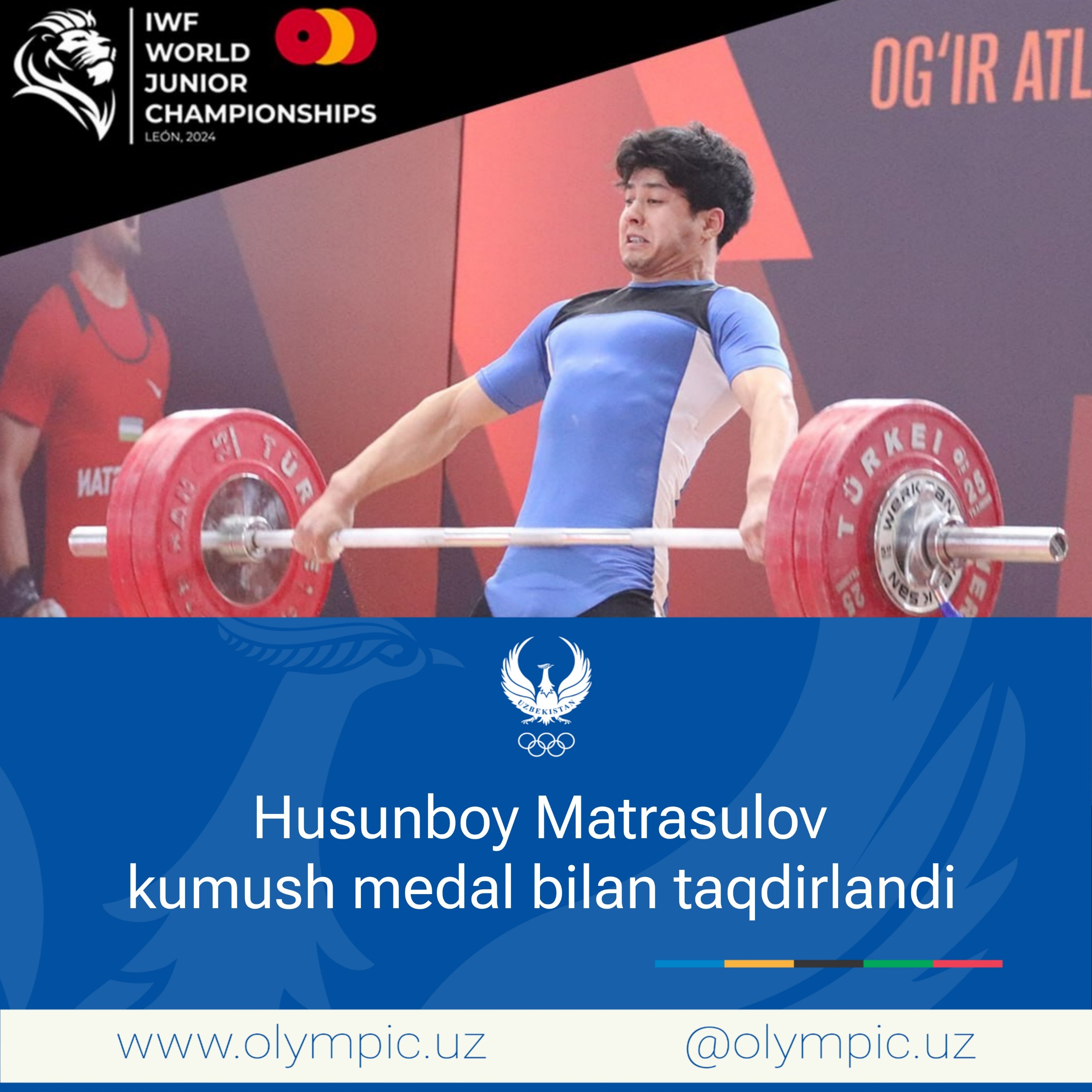 Испаниянинг Леон шаҳридан навбатдаги хушхабар. Оғир атлетика бўйича ёшлар ўртасида кечаётган жаҳон ч...